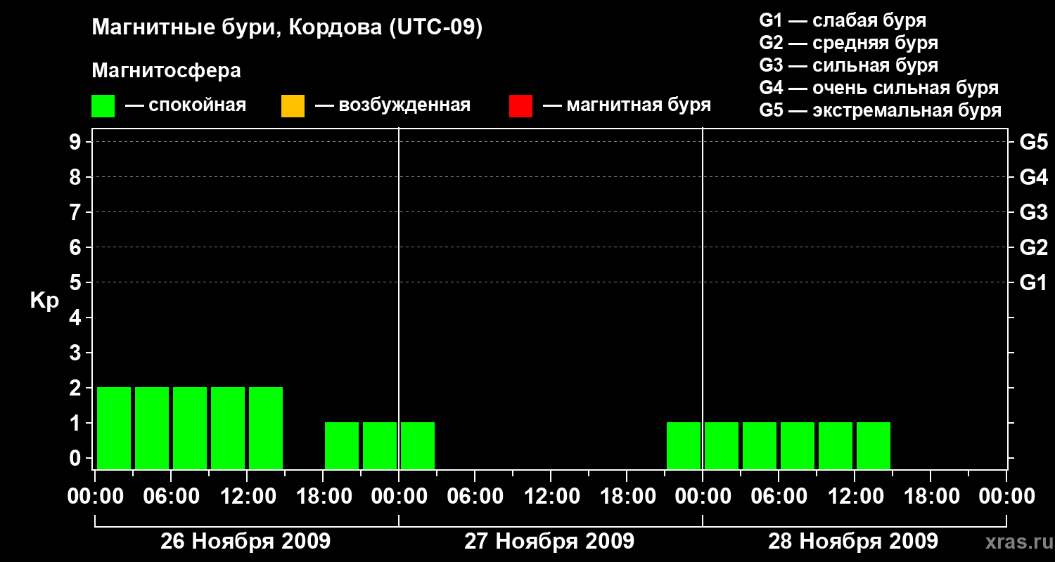 Изменения геомагнитного индекса Kp с 26 по 28 ноября 2009 года для средних широт