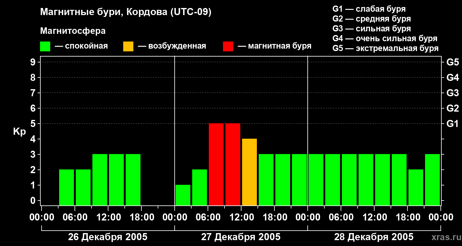 Изменения геомагнитного индекса Kp с 26 по 28 декабря 2005 года для средних широт