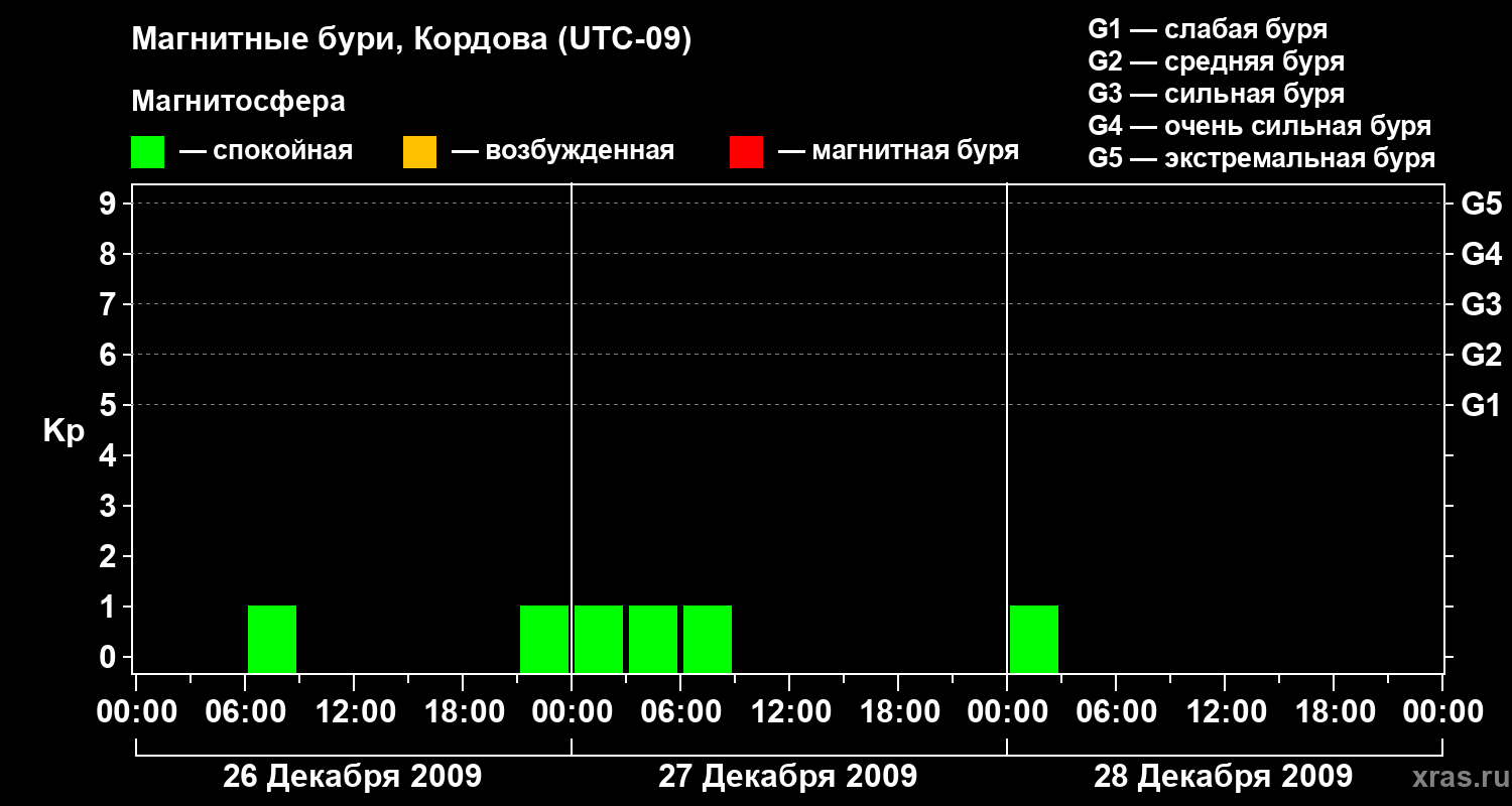 Изменения геомагнитного индекса Kp с 26 по 28 декабря 2009 года для средних широт