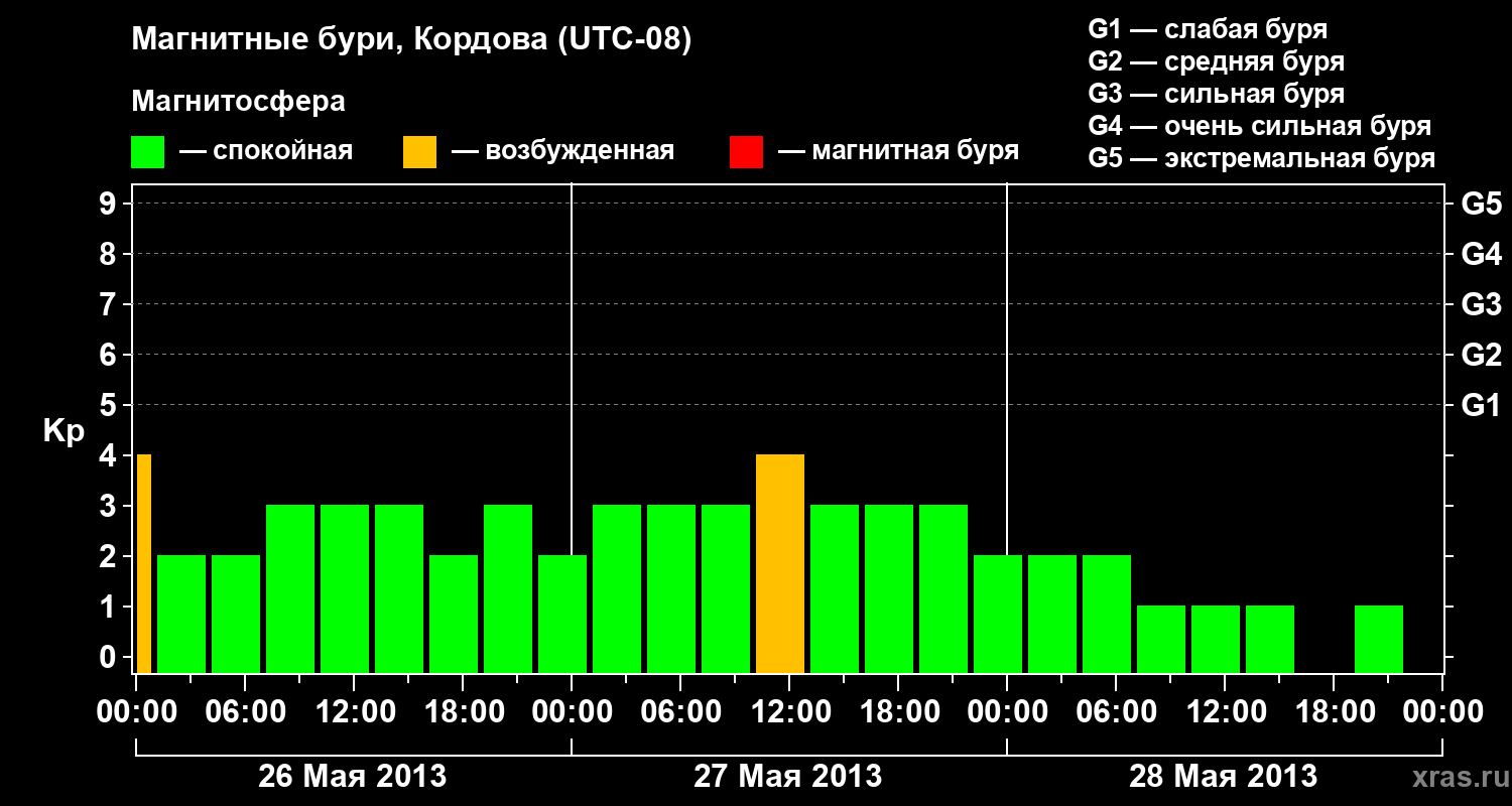 Изменения геомагнитного индекса Kp с 26 по 28 мая 2013 года для средних широт