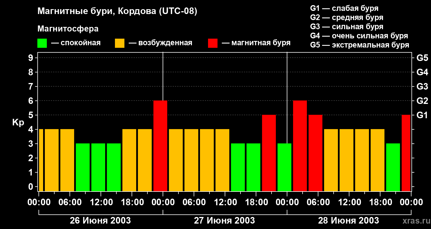 Изменения геомагнитного индекса Kp с 26 по 28 июня 2003 года для средних широт
