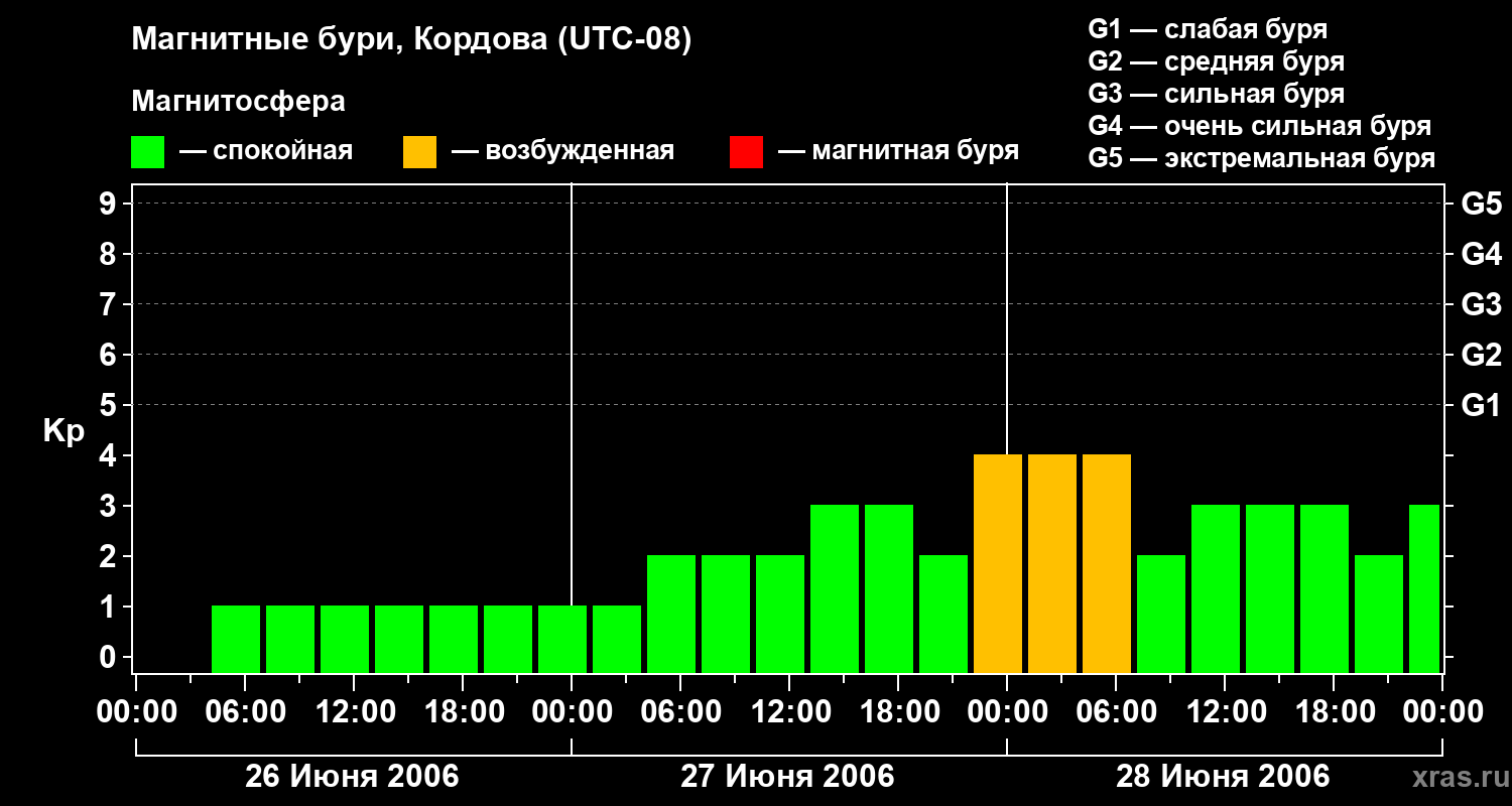 Изменения геомагнитного индекса Kp с 26 по 28 июня 2006 года для средних широт