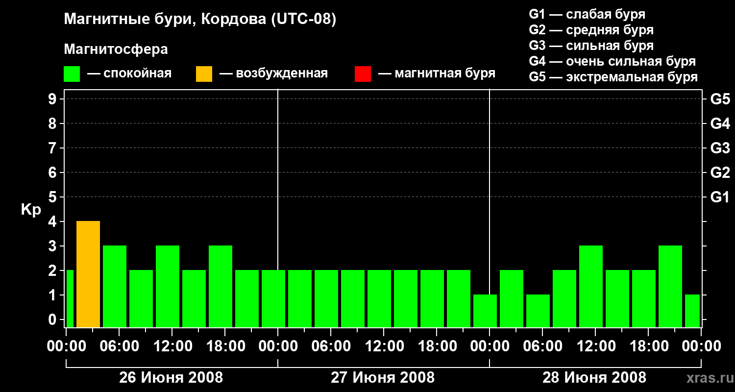 Изменения геомагнитного индекса Kp с 26 по 28 июня 2008 года для средних широт