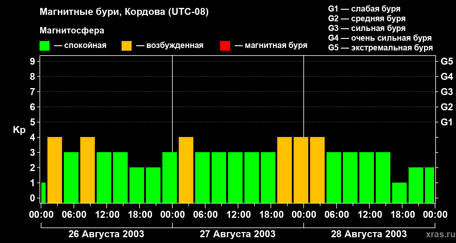 Изменения геомагнитного индекса Kp с 26 по 28 августа 2003 года для средних широт