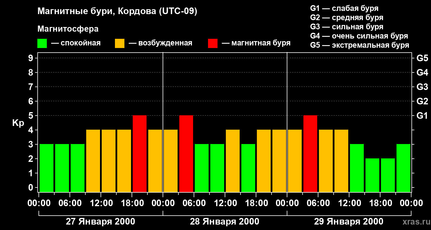Изменения геомагнитного индекса Kp с 27 по 29 января 2000 года для средних широт