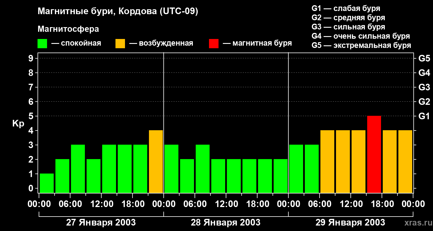 Изменения геомагнитного индекса Kp с 27 по 29 января 2003 года для средних широт