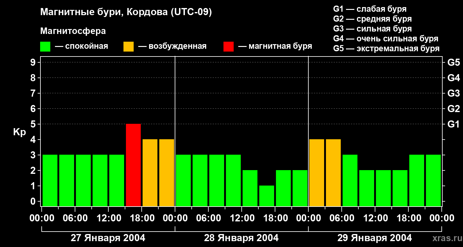 Изменения геомагнитного индекса Kp с 27 по 29 января 2004 года для средних широт