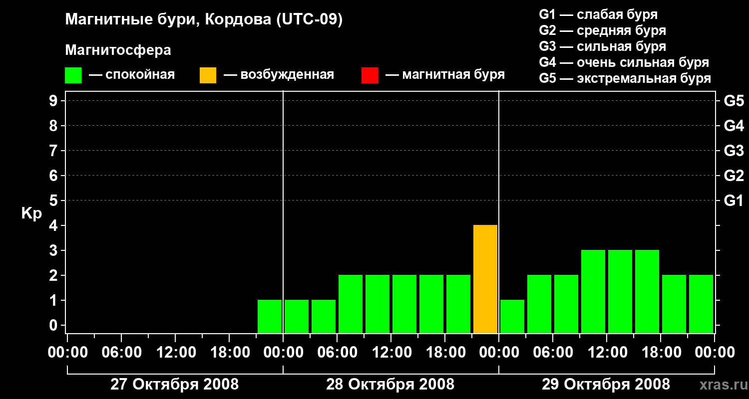 Изменения геомагнитного индекса Kp с 27 по 29 октября 2008 года для средних широт