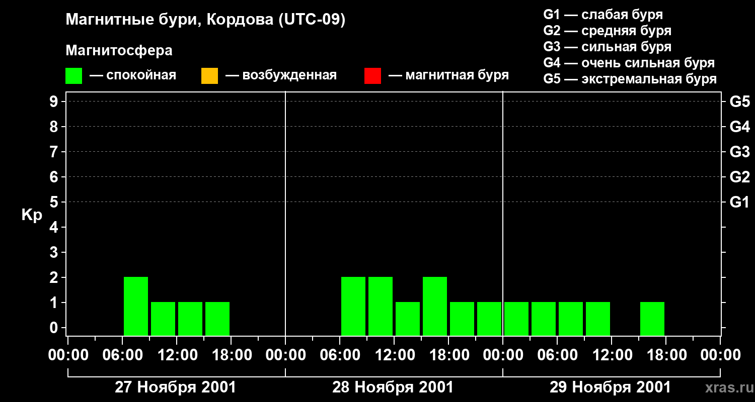 Изменения геомагнитного индекса Kp с 27 по 29 ноября 2001 года для средних широт