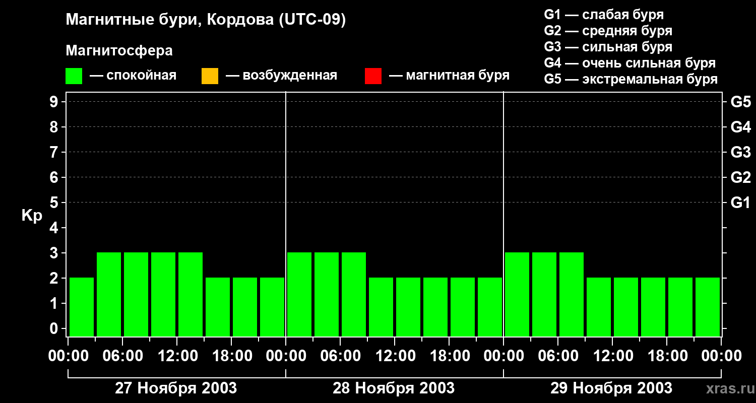 Изменения геомагнитного индекса Kp с 27 по 29 ноября 2003 года для средних широт