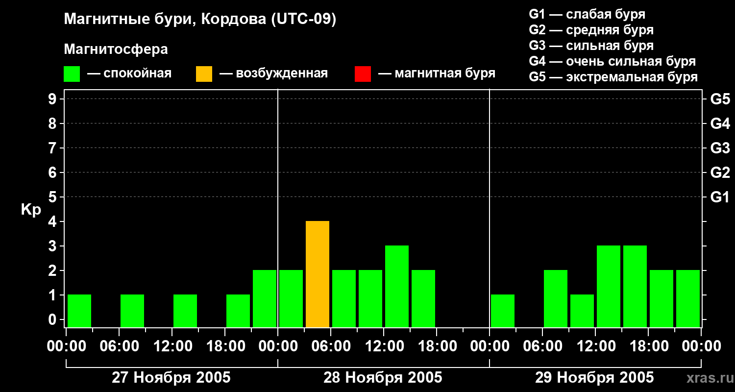 Изменения геомагнитного индекса Kp с 27 по 29 ноября 2005 года для средних широт