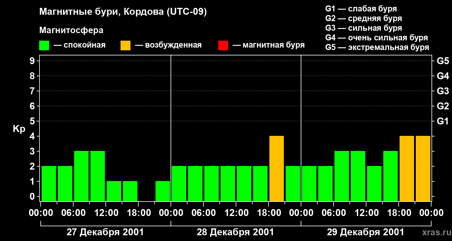 Изменения геомагнитного индекса Kp с 27 по 29 декабря 2001 года для средних широт