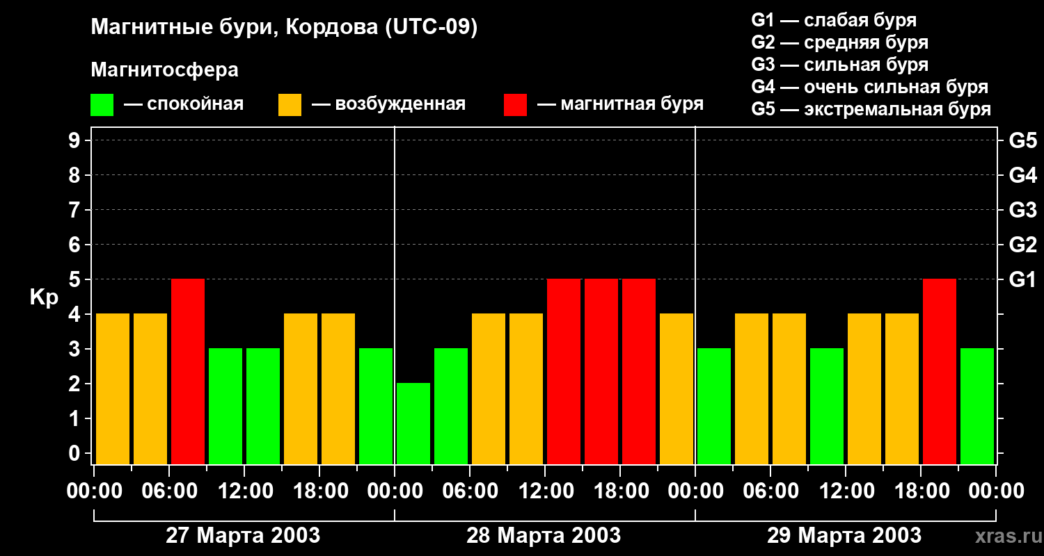 Изменения геомагнитного индекса Kp с 27 по 29 марта 2003 года для средних широт