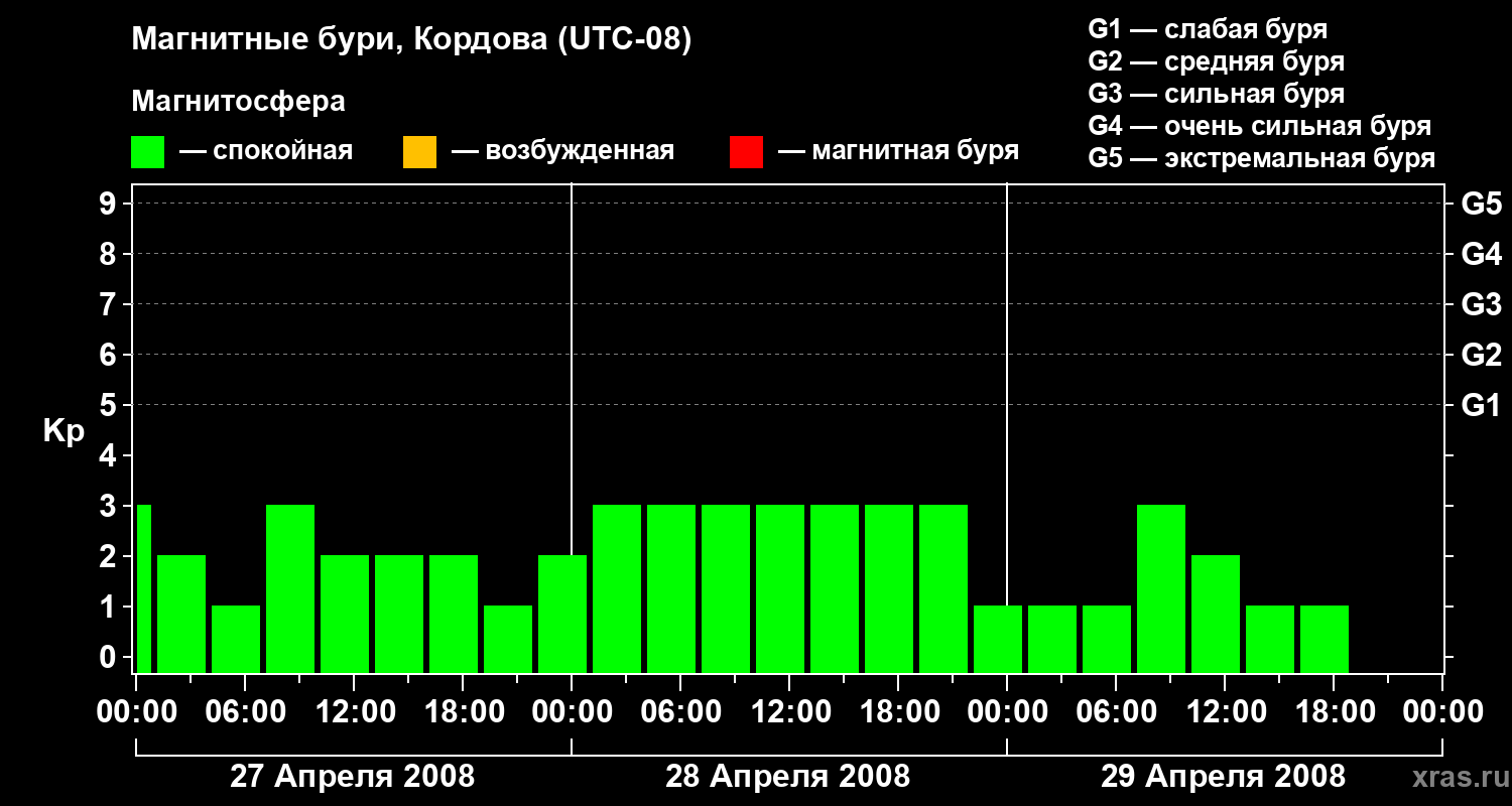 Изменения геомагнитного индекса Kp с 27 по 29 апреля 2008 года для средних широт