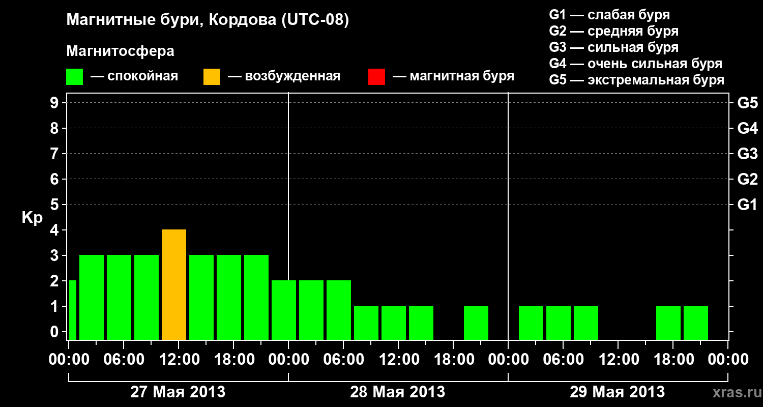 Изменения геомагнитного индекса Kp с 27 по 29 мая 2013 года для средних широт