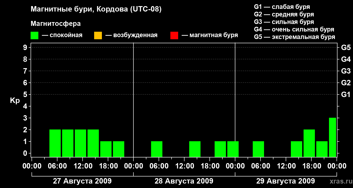 Изменения геомагнитного индекса Kp с 27 по 29 августа 2009 года для средних широт