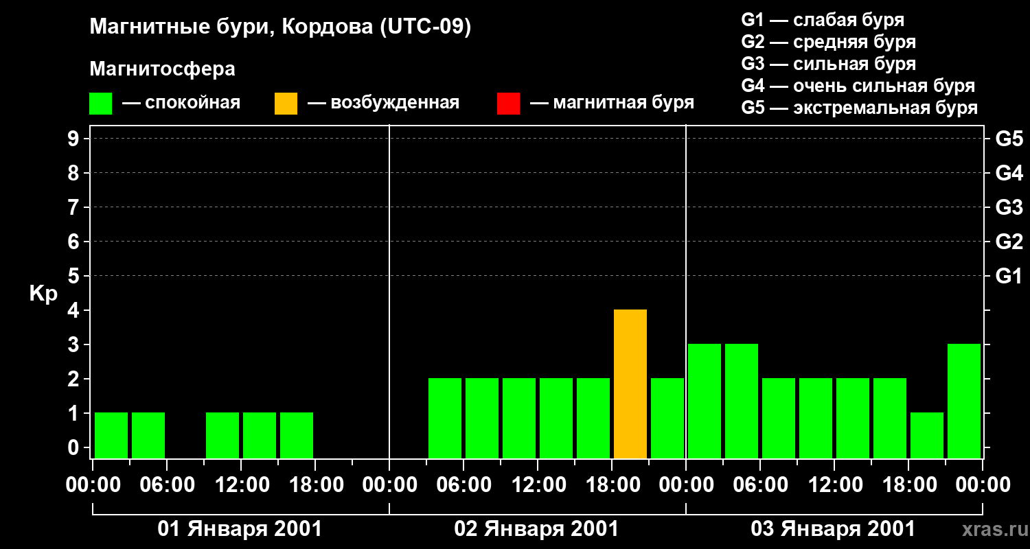 Изменения геомагнитного индекса Kp с 1 по 3 января 2001 года для средних широт