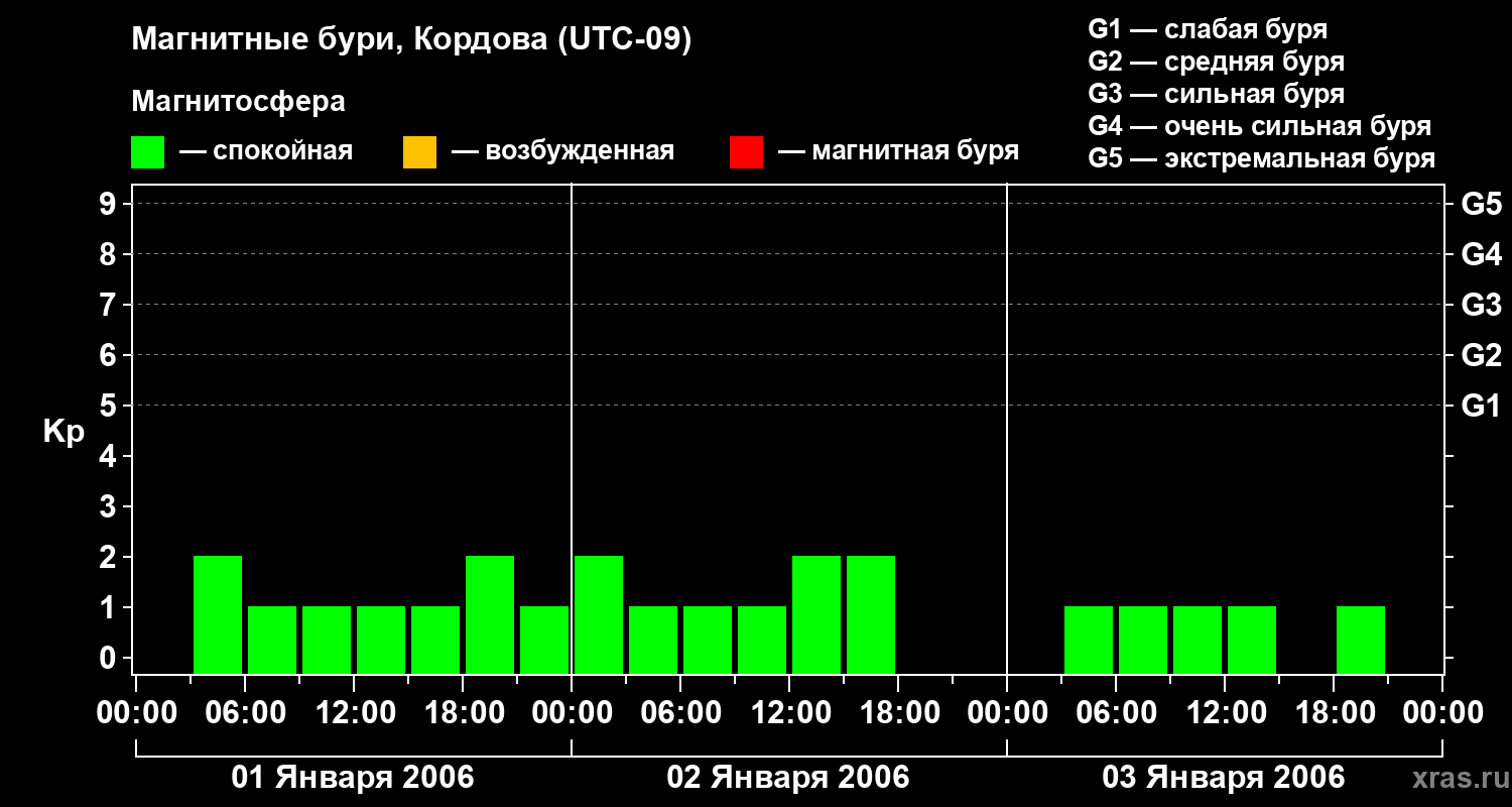 Изменения геомагнитного индекса Kp с 1 по 3 января 2006 года для средних широт