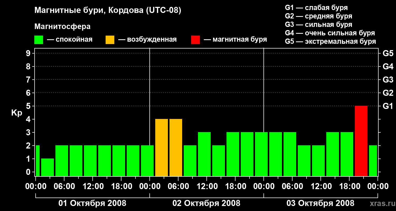 Изменения геомагнитного индекса Kp с 1 по 3 октября 2008 года для средних широт