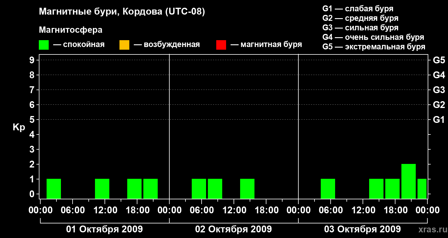 Изменения геомагнитного индекса Kp с 1 по 3 октября 2009 года для средних широт