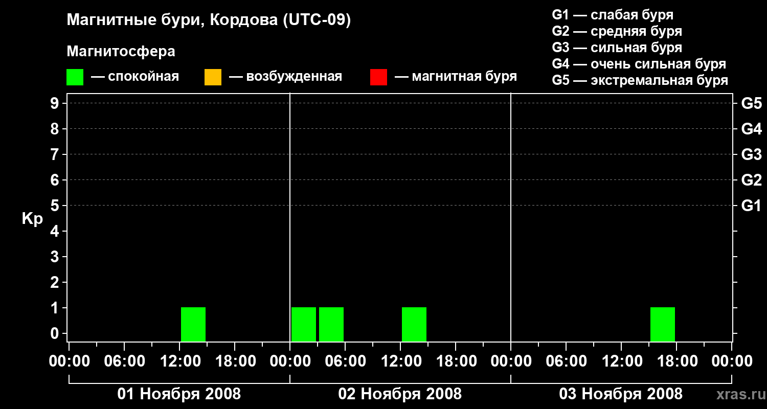 Изменения геомагнитного индекса Kp с 1 по 3 ноября 2008 года для средних широт