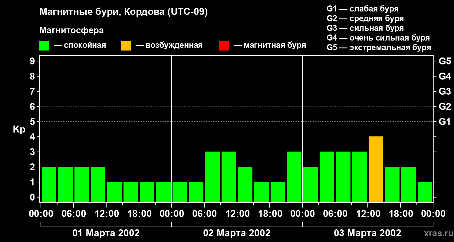 Изменения геомагнитного индекса Kp с 1 по 3 марта 2002 года для средних широт
