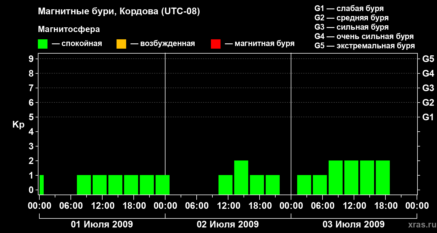 Изменения геомагнитного индекса Kp с 1 по 3 июля 2009 года для средних широт