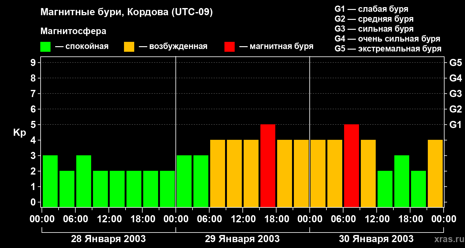 Изменения геомагнитного индекса Kp с 28 по 30 января 2003 года для средних широт
