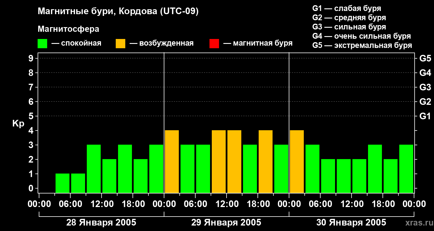 Изменения геомагнитного индекса Kp с 28 по 30 января 2005 года для средних широт