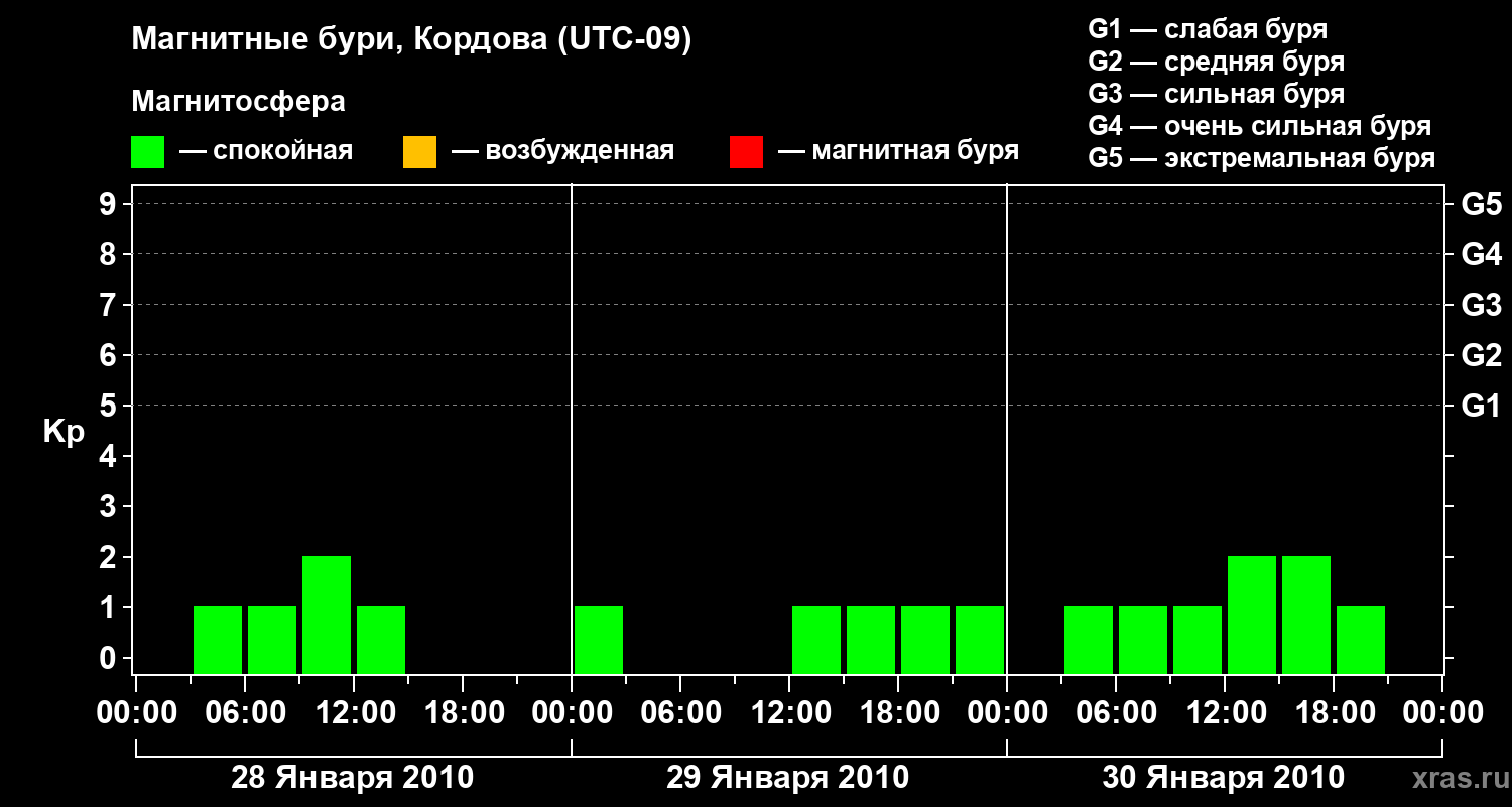 Изменения геомагнитного индекса Kp с 28 по 30 января 2010 года для средних широт