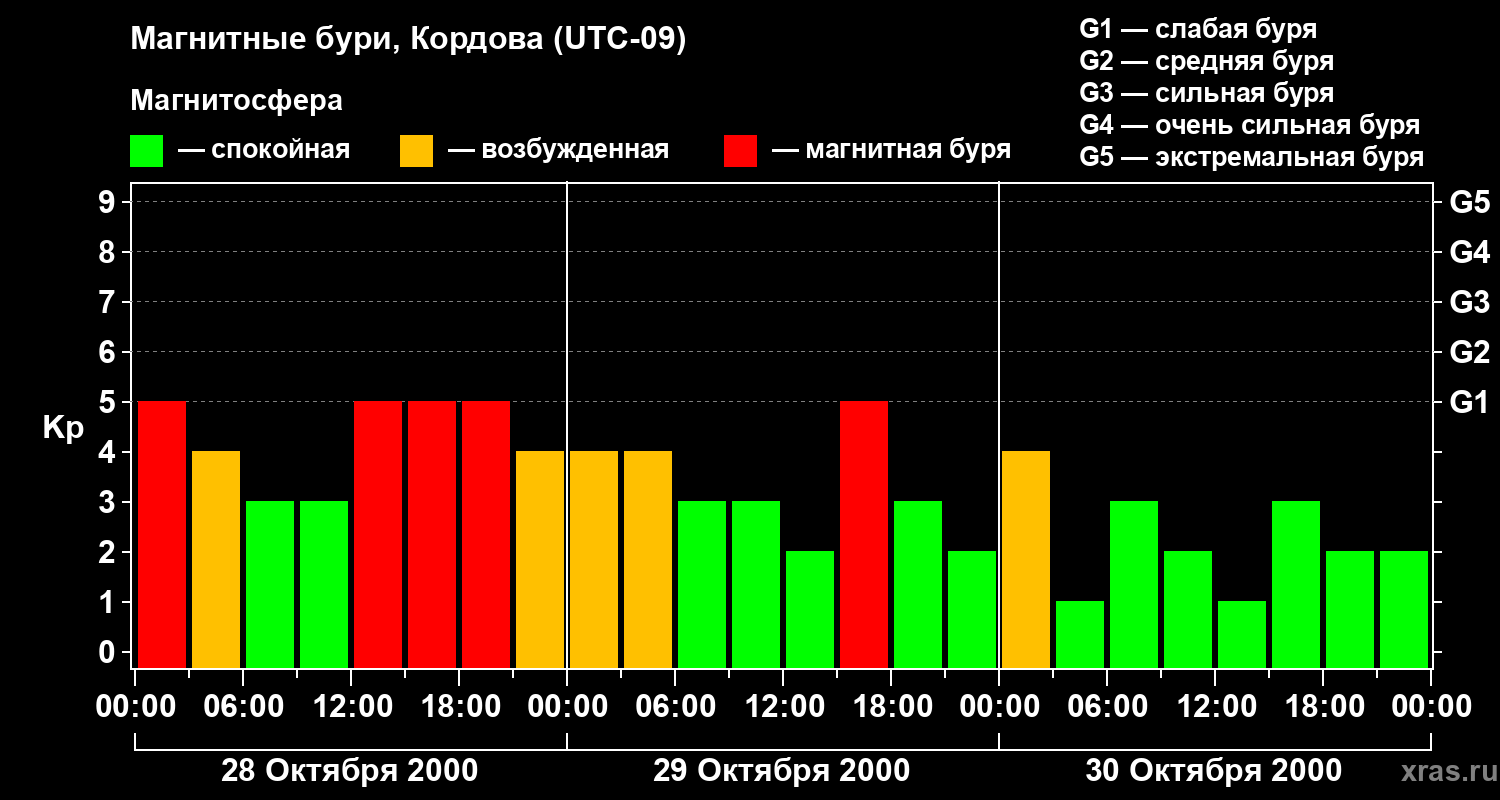 Изменения геомагнитного индекса Kp с 28 по 30 октября 2000 года для средних широт