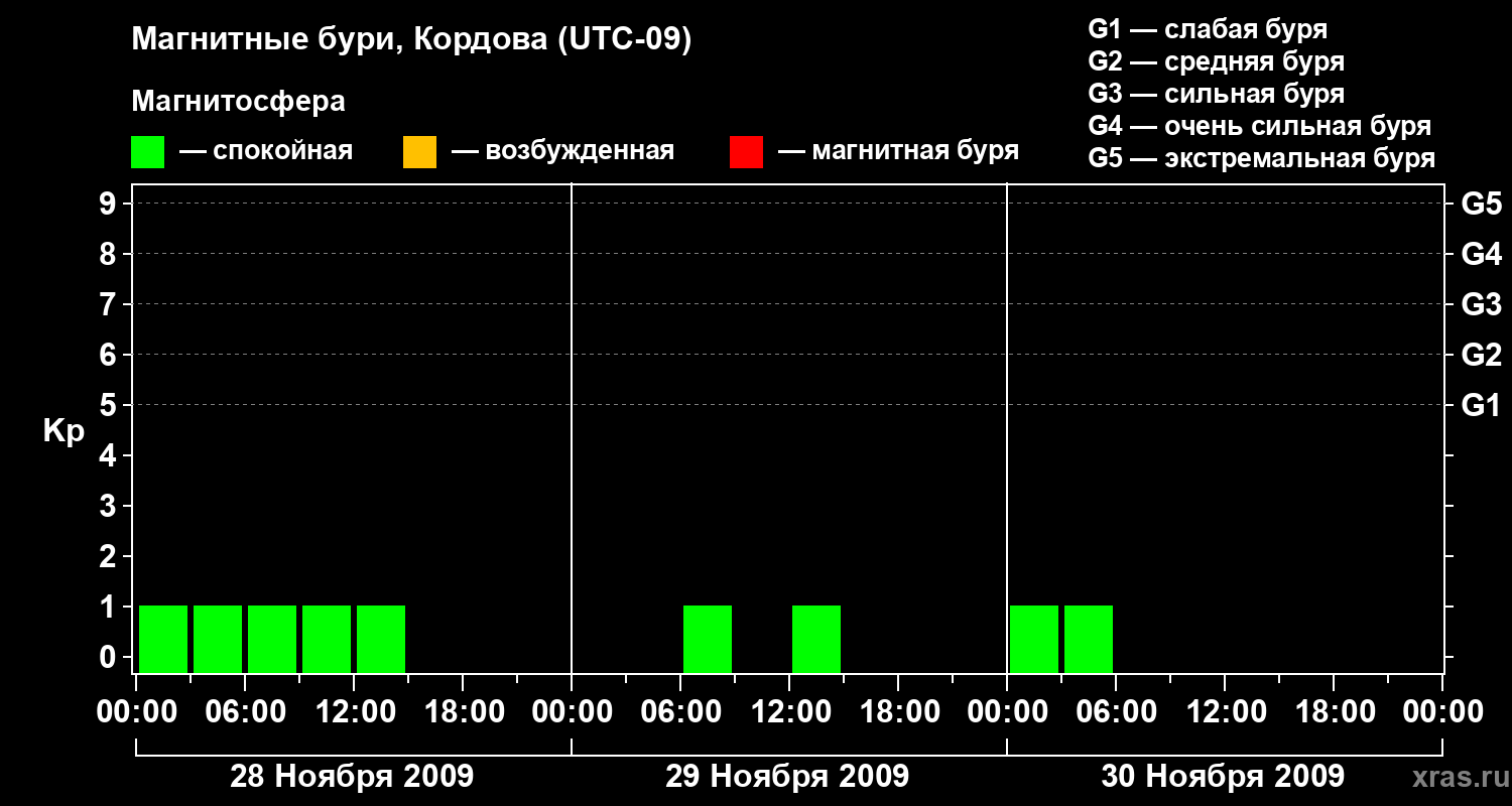 Изменения геомагнитного индекса Kp с 28 по 30 ноября 2009 года для средних широт