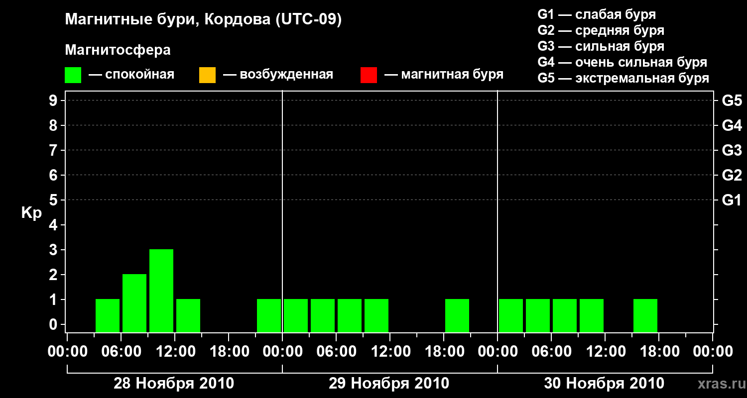 Изменения геомагнитного индекса Kp с 28 по 30 ноября 2010 года для средних широт
