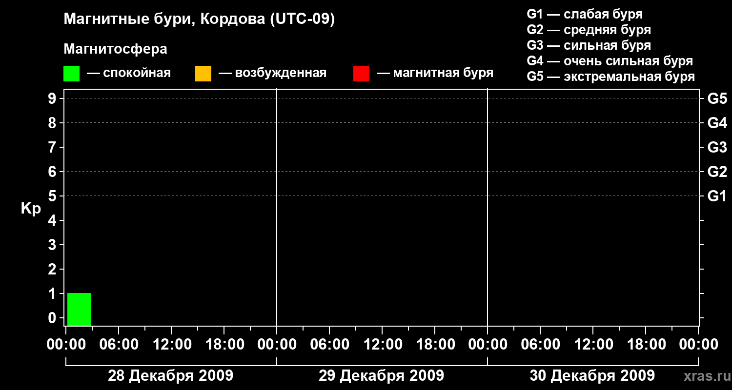 Изменения геомагнитного индекса Kp с 28 по 30 декабря 2009 года для средних широт