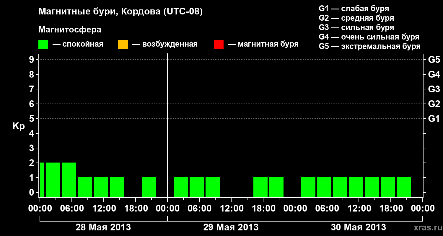Изменения геомагнитного индекса Kp с 28 по 30 мая 2013 года для средних широт