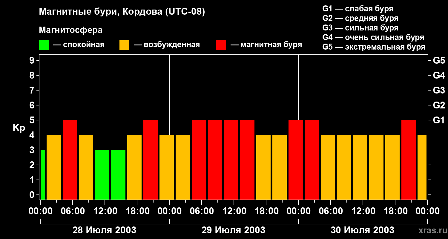 Изменения геомагнитного индекса Kp с 28 по 30 июля 2003 года для средних широт
