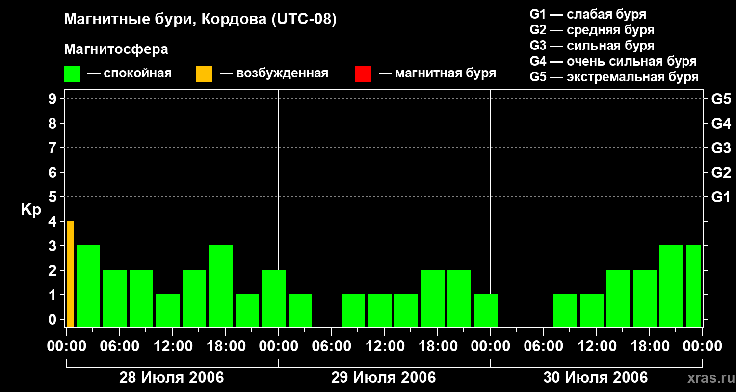 Изменения геомагнитного индекса Kp с 28 по 30 июля 2006 года для средних широт