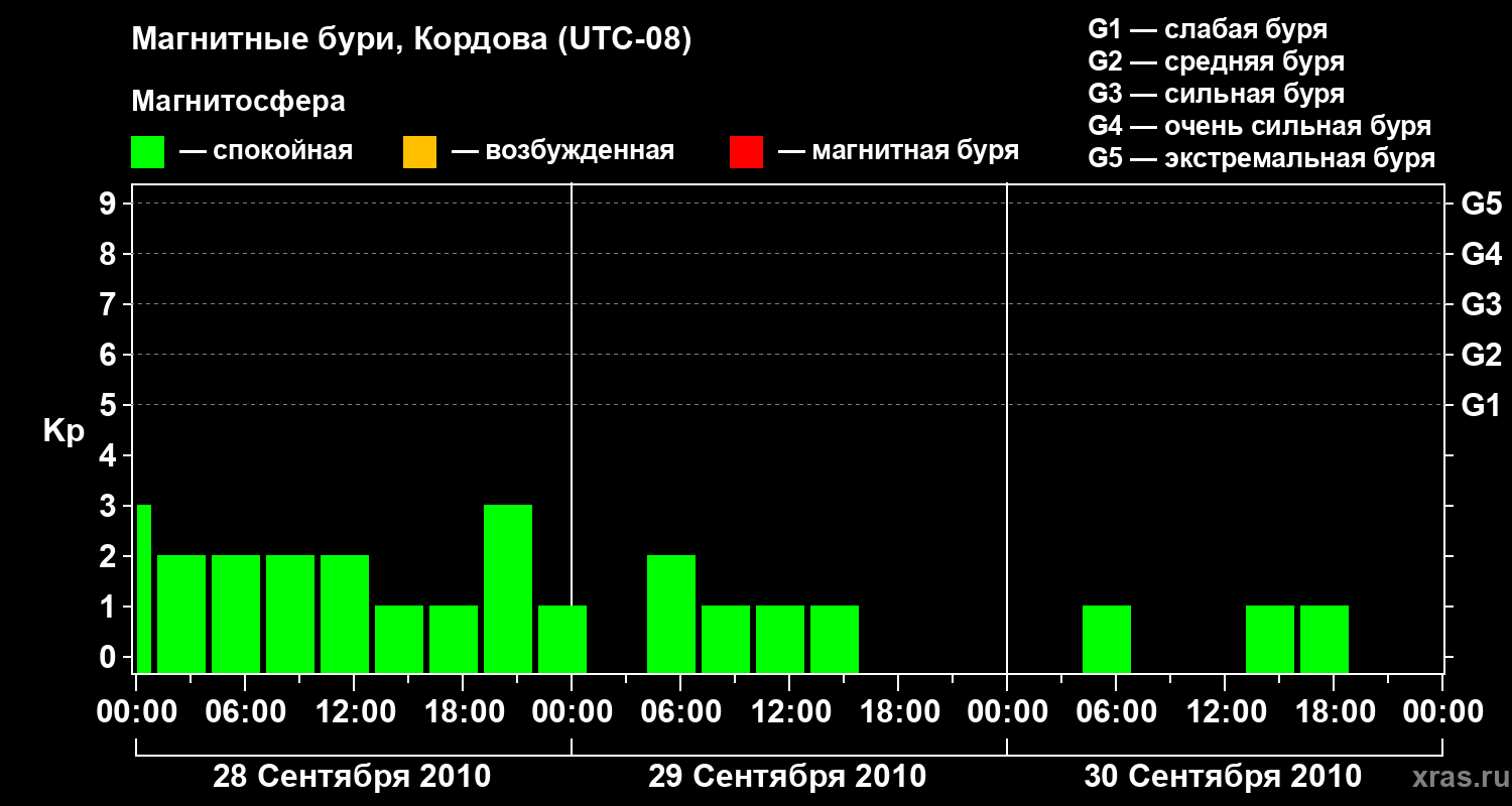 Изменения геомагнитного индекса Kp с 28 по 30 сентября 2010 года для средних широт