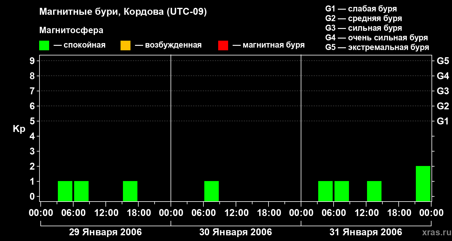 Изменения геомагнитного индекса Kp с 29 по 31 января 2006 года для средних широт