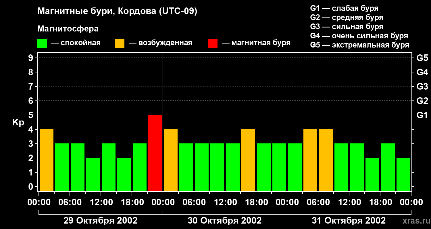Изменения геомагнитного индекса Kp с 29 по 31 октября 2002 года для средних широт