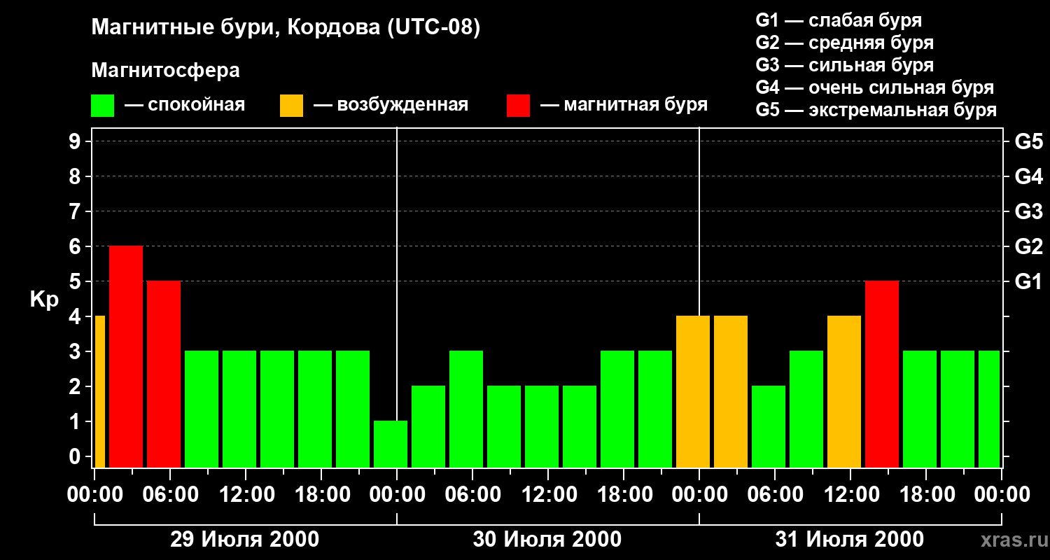 Изменения геомагнитного индекса Kp с 29 по 31 июля 2000 года для средних широт