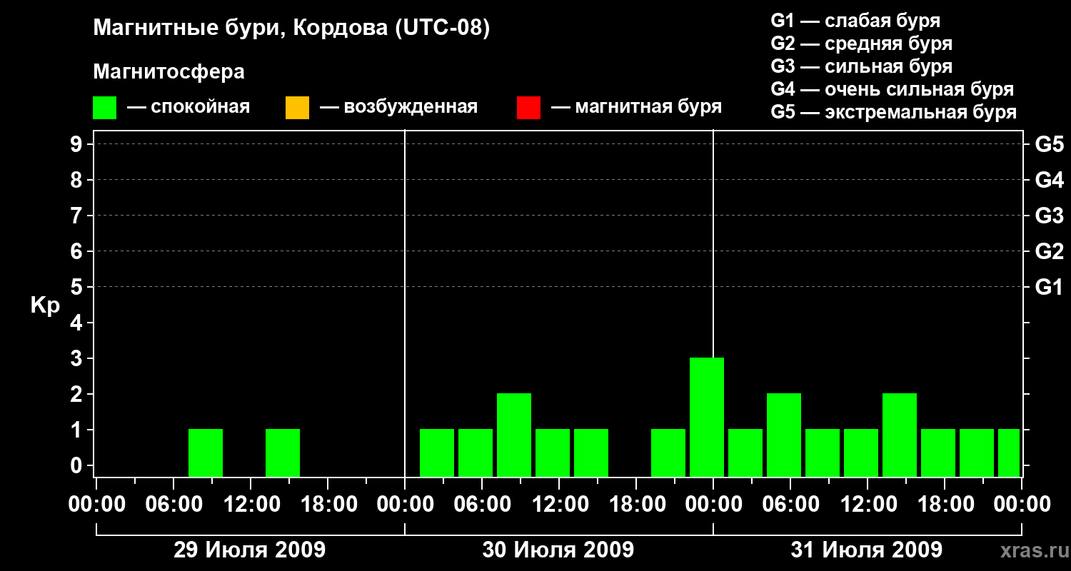 Изменения геомагнитного индекса Kp с 29 по 31 июля 2009 года для средних широт