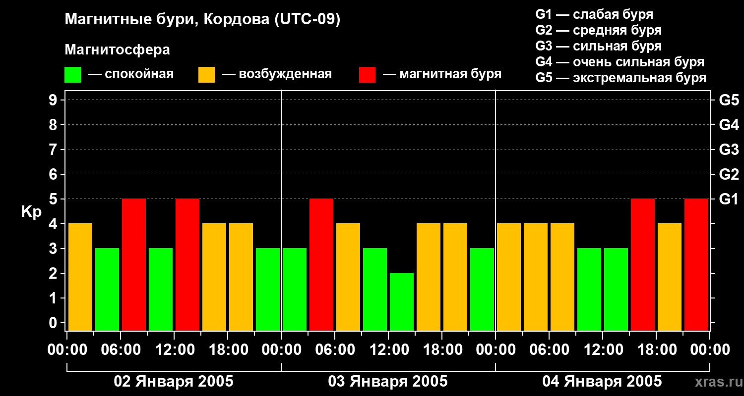 Изменения геомагнитного индекса Kp с 2 по 4 января 2005 года для средних широт