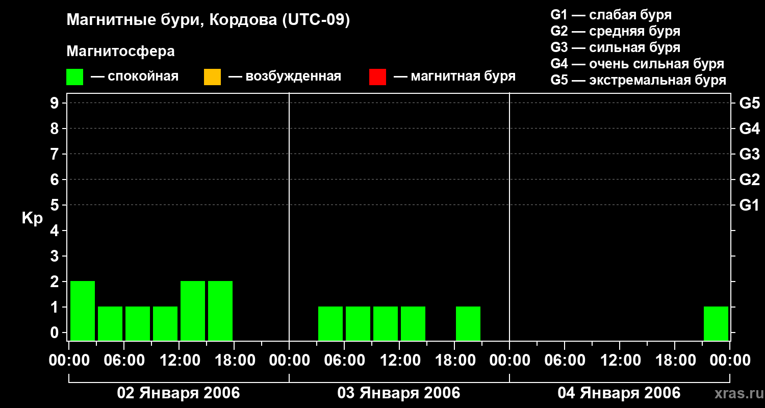 Изменения геомагнитного индекса Kp с 2 по 4 января 2006 года для средних широт