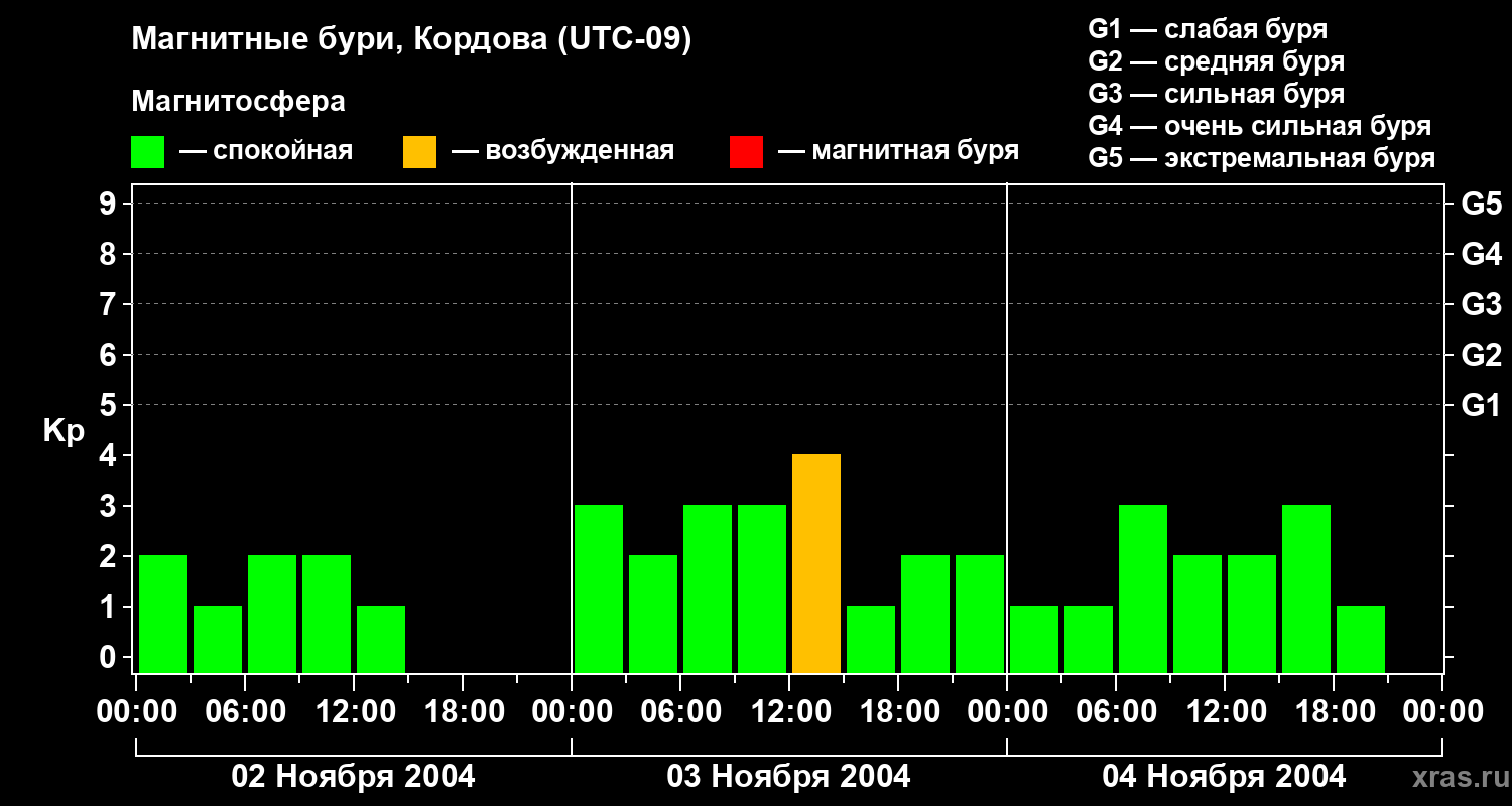 Изменения геомагнитного индекса Kp с 2 по 4 ноября 2004 года для средних широт