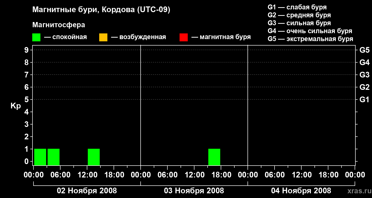 Изменения геомагнитного индекса Kp с 2 по 4 ноября 2008 года для средних широт
