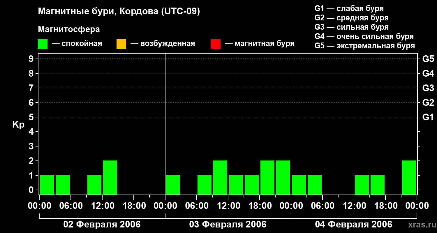 Изменения геомагнитного индекса Kp с 2 по 4 февраля 2006 года для средних широт