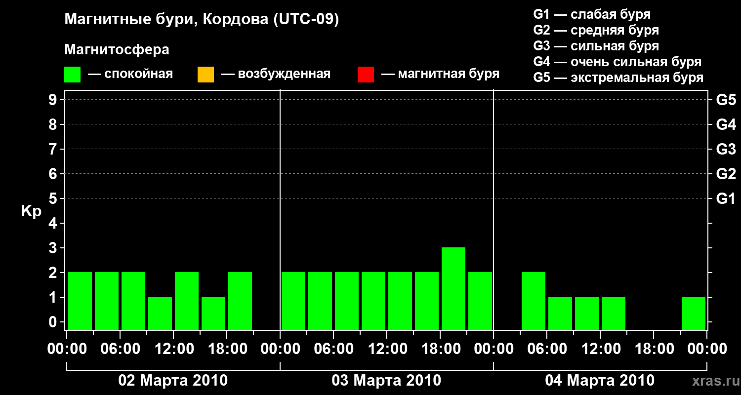 Изменения геомагнитного индекса Kp с 2 по 4 марта 2010 года для средних широт
