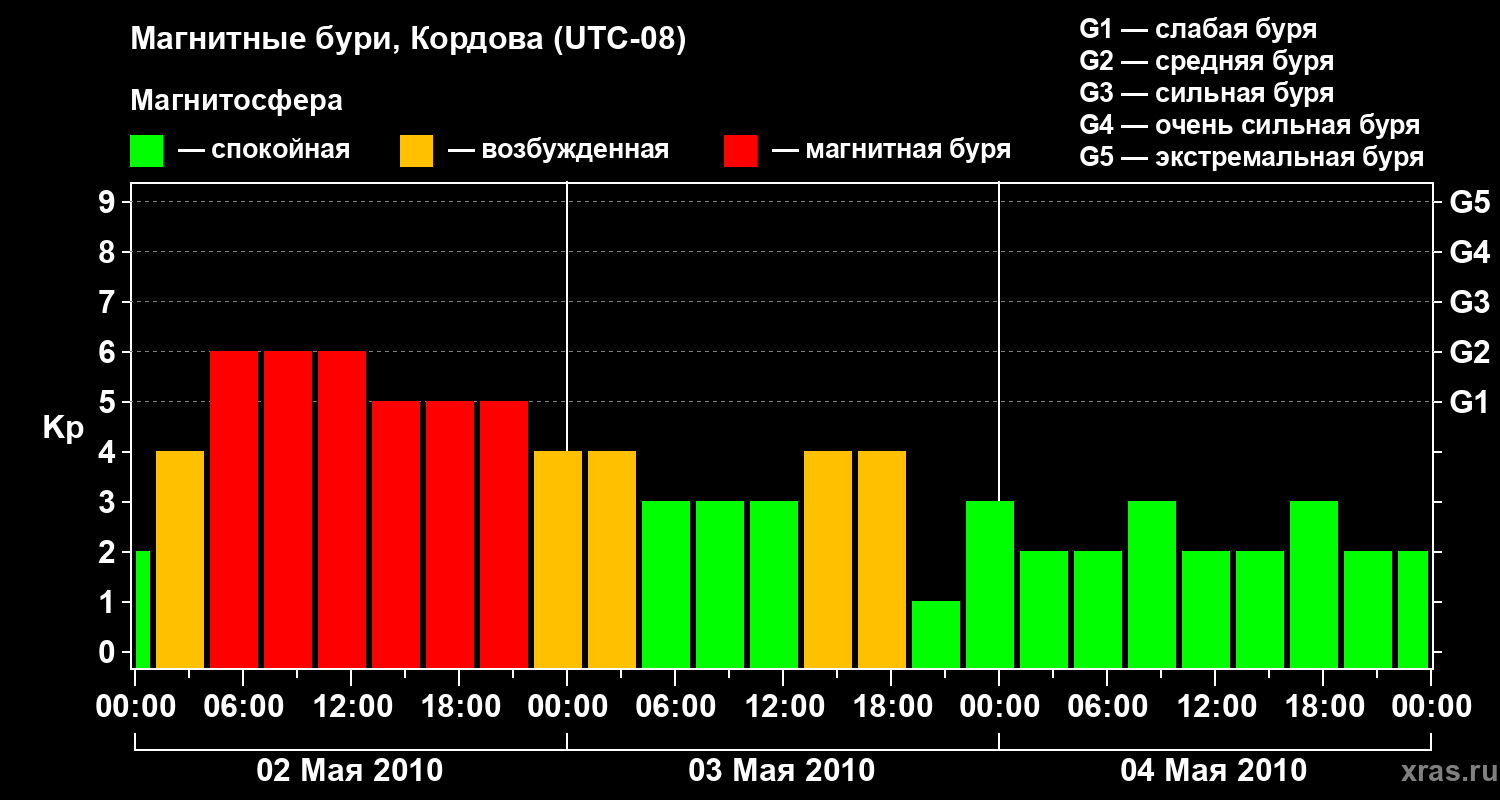 Изменения геомагнитного индекса Kp с 2 по 4 мая 2010 года для средних широт