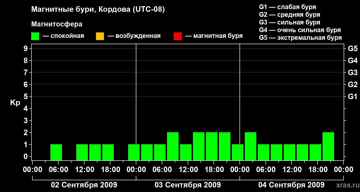 Изменения геомагнитного индекса Kp с 2 по 4 сентября 2009 года для средних широт